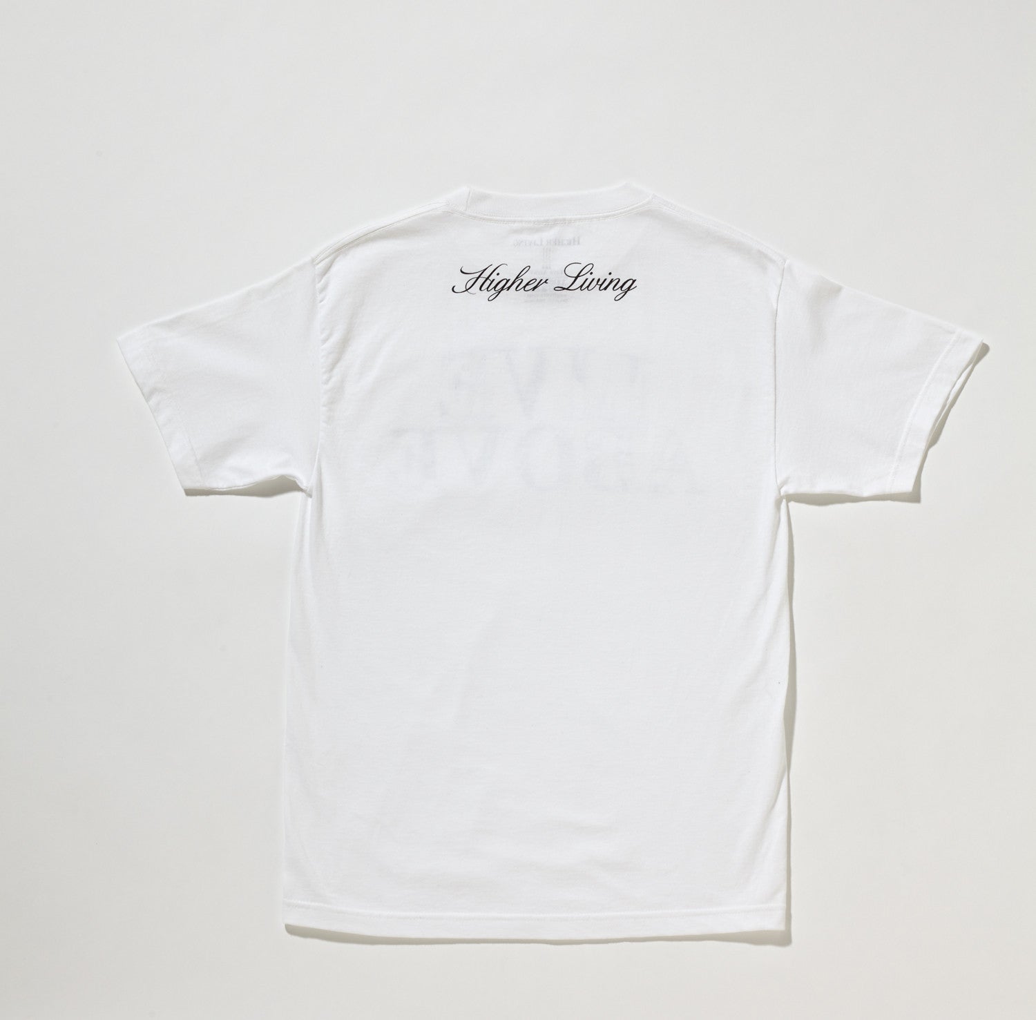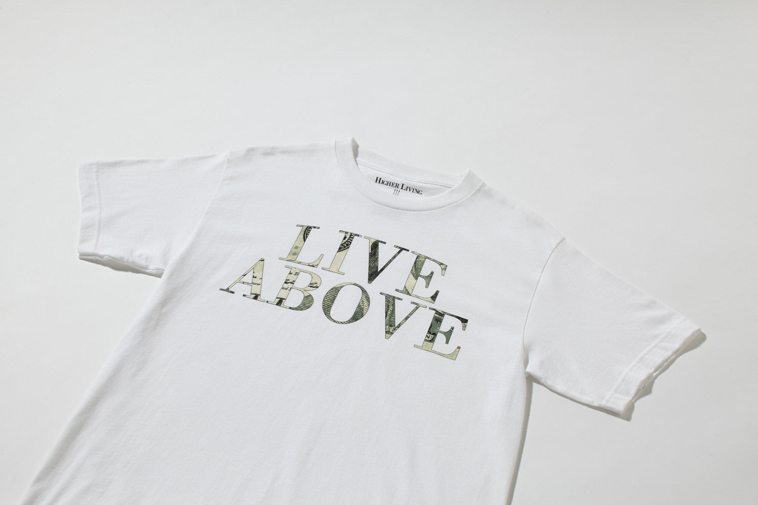 White 100% cotton short sleeve tee with "LIVE ABOVE" print on chest with details of " $100 DOLLAR BILL" inside lettering. Preshrunk to minimize shrinking. Fits true to size.